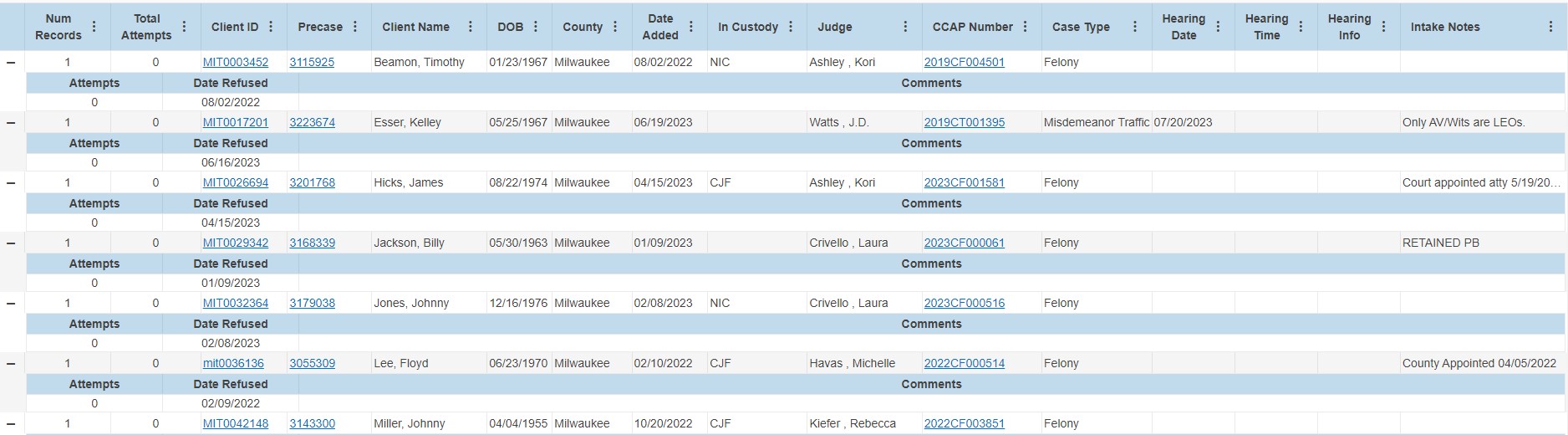 I am currently working on a report in which I need to embed a table (with its own headers) into another table. I am trying to make my telerik report match the table in the attached "Model Table.jpg" where the main table has the headers "num records", "total attempts", "client ID", etc.. and the embedded table has the headers "attempts", "date refused", and "comments".