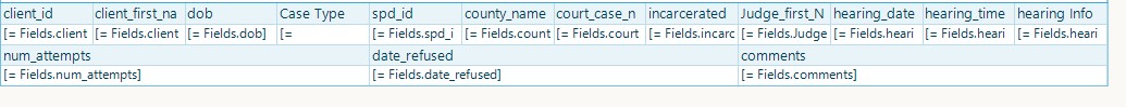 I then attempted adding a subreport inside the main table. This subreport links to a separate report containing the "attempts", "date refused", and "comments" table. However, I ran into some roadblocks with this as well. When the subreport is outside the table, it loads fine with all values showing. Unfortunately, when I move the subreport into the main table, I cannot get it to load properly. When I add the datasource to the subreport (same datasource as the main report), the subreport doesn't show at all. When I remove the datasource from the subreport, the headers of the sub table show, but no data loads. Is there a reason the subreport wont load properly inside the table?