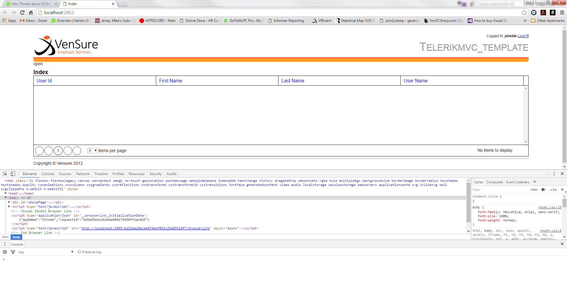 using System.Collections.Generic;using System.Web.Mvc;using Kendo.Mvc.Extensions;using Kendo.Mvc.UI;using TelerikMVC_Template.Models;using TelerikMVC_Template.Repository;namespace TelerikMVC_Template.Controllers{ [Authorize] public class HomeController : Controller { private readonly IUserRepository userRepository = new UserRepository(new VUsersContext()); // GET: Home public ActionResult Index() { return View(); } [HttpGet] [ActionName("AllUsers")] public JsonResult AllUsers([DataSourceRequest]DataSourceRequest request) { IEnumerable<User> theseUsers = userRepository.SelectAll(); return Json(theseUsers.ToDataSourceResult(request), JsonRequestBehavior.AllowGet); } }}And finally my User class definition: