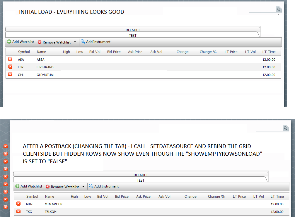 I've been busy with Client Side Databinding and have been struggling to find a solution to my problem. I've recently found that there is a property (RadGrid.ClientSettings.DataBinding.ShowEmptyRowsOnLoad) which helps but after doing a postback the emptyrows are showing again. Please see attachment below.