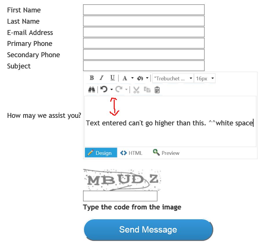 The text editing area of the editor seems to have about 3 lines worth of white space at the top that I can't reach or get rid of. I've tried various settings and width/height combinations but there is always that empty white space at the top. The code for the Editor I am using is enclosed below along with a screen capture. Thanks for any help in getting rid of the white space at the top.
