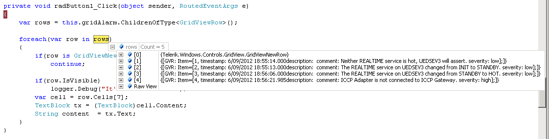 private void radButton1_Click(object sender, RoutedEventArgs e) { var rows = this.gridAlarm.ChildrenOfType<GridViewRow>(); foreach(var row in rows) { if(row is GridViewNewRow) continue; if(row.IsVisible) logger.Debug("It's a visible row"); var cell = row.Cells[7]; TextBlock tx = (TextBlock)cell.Content; String content = tx.Text; } }The "rows" collection has 4 columns, I attach two screen prints so you can see what I am talking about.