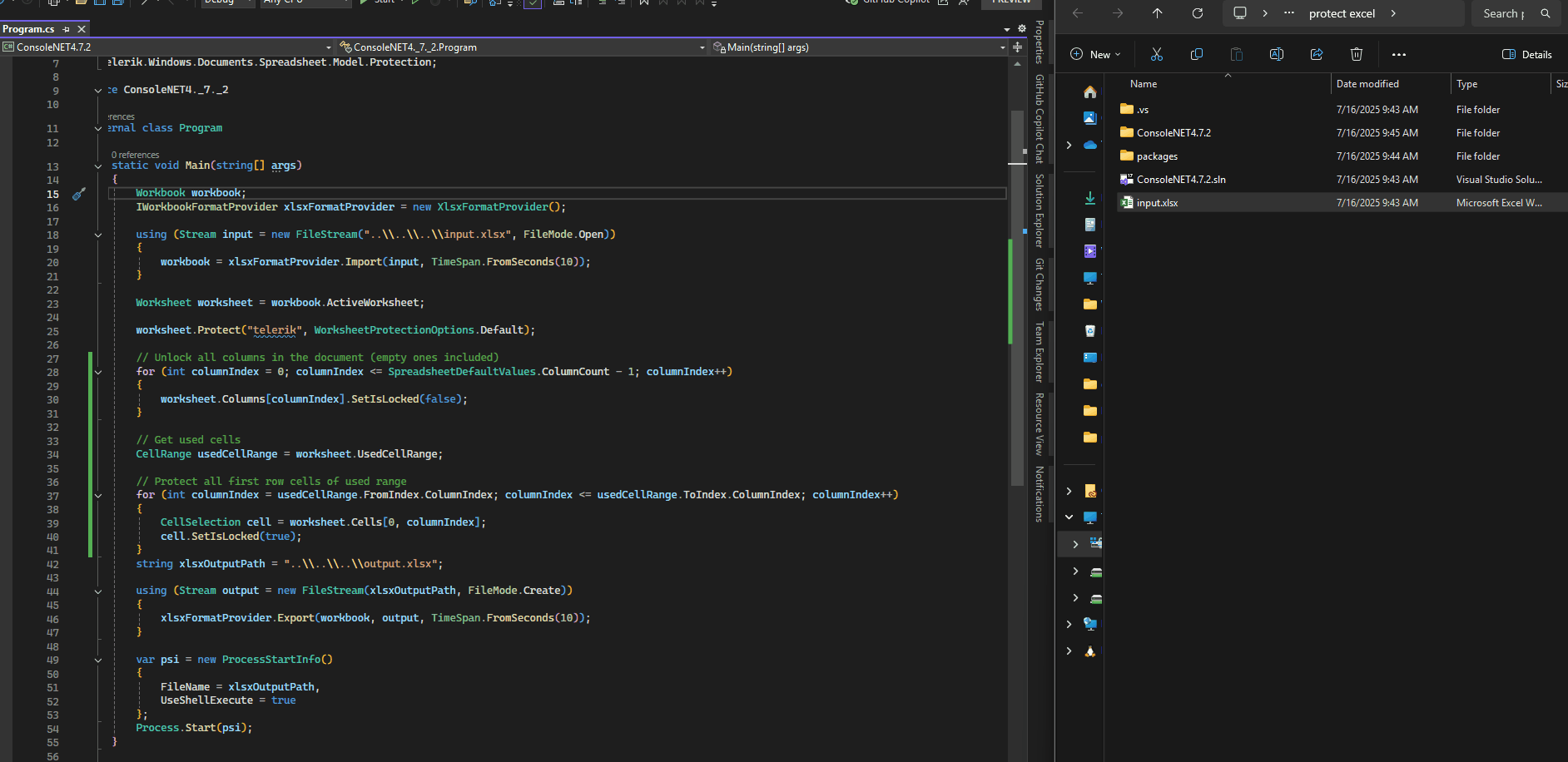 Worksheet worksheet = workbook.ActiveWorksheet; worksheet.Protect("telerik", WorksheetProtectionOptions.Default); CellRange usedCellRange = worksheet.UsedCellRange; for (int rowIndex = usedCellRange.FromIndex.RowIndex; rowIndex <= usedCellRange.ToIndex.RowIndex; rowIndex++) { for (int columnIndex = usedCellRange.FromIndex.ColumnIndex; columnIndex <= usedCellRange.ToIndex.ColumnIndex; columnIndex++) { CellSelection cell = worksheet.Cells[rowIndex, columnIndex]; if (rowIndex == 0) { cell.SetIsLocked(true); } else { cell.SetIsLocked(false); } } }Here are some related articles on the topic: