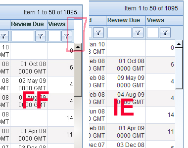 I do have one additional question. There is a difference between in rendering between browsers. In IE, The header goes all the way to the right, while all other browsers Firefox 3.5.9 and 3.6.3, Safari 4.0.3, IE 8.0, Chrome 4.1.2 display a gap between the last column and the edge of the grid.