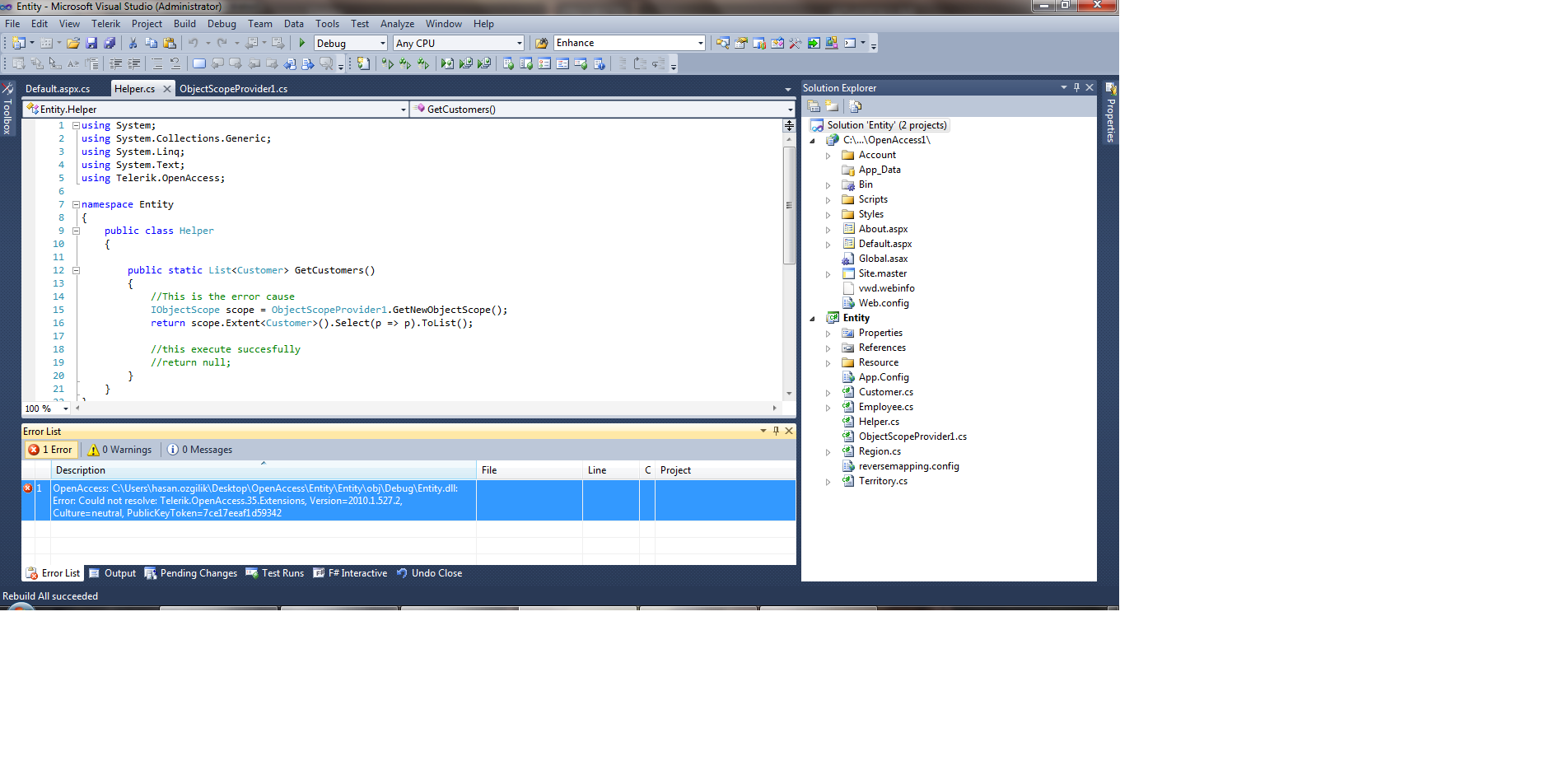 Error 102 OpenAccess: C:\Users\hasan.ozgilik\Desktop\OpenAccess\Entity\Entity\obj\Debug\Entity.dll: Error: Could not resolve: Telerik.OpenAccess.35.Extensions, Version=2010.1.527.2, Culture=neutral, PublicKeyToken=7ce17eeaf1d59342