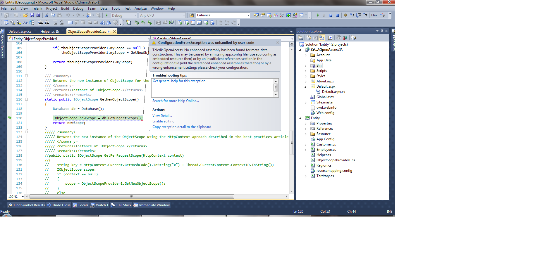 Telerik.OpenAccess: No enhanced assembly has been found for meta-data construction. This may be caused by a missing app.config file (use app.config as embedded resource then) or by an insufficient references section in the configuration file (add the referenced enhanced assemblies there too) or by a wrong enhancement setting; please check your configuration.