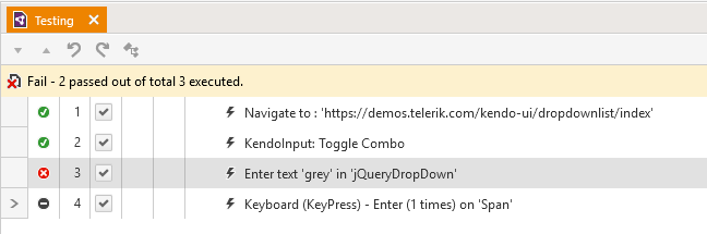 Actually I entered text into the same drop down element, just that I rename the drop down element to 'jQueryDropDown'. But even after I renamed the drop down element, the step to open / toggle will still remain as "KendoInput: Toggle Combo". So in the execution log it seems like I am performing steps on two different elements but actually on exact the same one.
