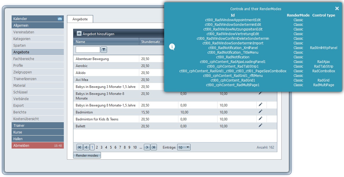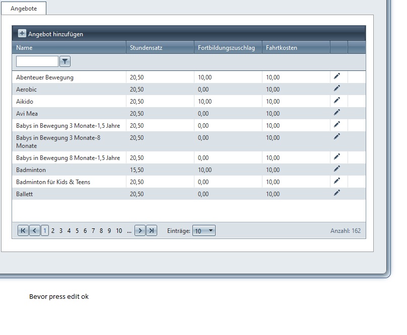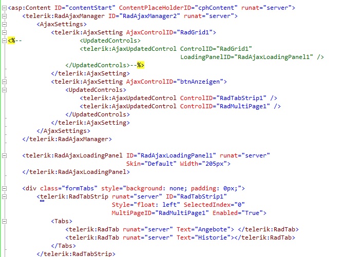 <%@ Page Language="vb" MasterPageFile="~/main.Master" CodeFile="allgemein_angebote.aspx.vb" Inherits="allgemein_angebote" %><%@ Register assembly="Telerik.Web.UI" namespace="Telerik.Web.UI" tagprefix="telerik" %><%--17.10.17/PahlkeAenderungen am Layout.--%><asp:Content ID="contentHead" ContentPlaceHolderID="cphHead" runat="server"> <style type="text/css"> div.noWrapRadListBox .rlbText{ white-space: nowrap; } .auto-style4 { width: 540px; } .auto-style5 { width: 116px; } .auto-style11 { width: 112px; } .auto-style12 { margin: 20px; height: 291px; width: 496px; } .auto-style13 { width: 116px; height: 28px; } .auto-style14 { height: 28px; } </style> <script type = "text/javascript"> </script></asp:Content><asp:Content ID="contentStart" ContentPlaceHolderID="cphContent" runat="server"> <telerik:RadAjaxManager ID="RadAjaxManager2" runat="server"> <AjaxSettings> <telerik:AjaxSetting AjaxControlID="RadGrid1"> <UpdatedControls> <telerik:AjaxUpdatedControl ControlID="RadGrid1" LoadingPanelID="RadAjaxLoadingPanel1" /> </UpdatedControls> </telerik:AjaxSetting> <telerik:AjaxSetting AjaxControlID="btnAnzeigen"> <UpdatedControls> <telerik:AjaxUpdatedControl ControlID="RadTabStrip1" /> <telerik:AjaxUpdatedControl ControlID="RadMultiPage1" /> </UpdatedControls> </telerik:AjaxSetting> </AjaxSettings> </telerik:RadAjaxManager> <telerik:RadAjaxLoadingPanel ID="RadAjaxLoadingPanel1" runat="server" Skin="Default" Width="205px"> </telerik:RadAjaxLoadingPanel> <div class="formTabs" style="background: none; padding: 0px;"> <telerik:RadTabStrip runat="server" ID="RadTabStrip1" Style="float: left" SelectedIndex="0" MultiPageID="RadMultiPage1" Enabled="True"> <Tabs> <telerik:RadTab runat="server" Text="Angebote"> </telerik:RadTab> <telerik:RadTab runat="server" Text="Historie"></telerik:RadTab> </Tabs> </telerik:RadTabStrip> <div style="clear: both;"></div> </div> <div class="formContainer formTrainer" style="clear: both; margin: 0; padding: 20px; background-color: #FFF; height: 430px"> <telerik:RadMultiPage runat="server" ID="RadMultiPage1" SelectedIndex="0" CssClass="multiPage" Enabled="True" Width="100%"> <telerik:RadPageView ID="RadPageViewAngebote" runat="server" CssClass="corporatePageView" Width="100%"> <telerik:RadGrid ID="RadGrid1" runat="server" AllowAutomaticDeletes="True" AllowFilteringByColumn="True" AllowSorting="True" AutoGenerateColumns="False" TableLayout="Fixed" meta:resourcekey="RadGrid1Resource1" Skin="WebBlue" AllowPaging="True" Width="702px" Culture="de-DE"> <ExportSettings> <Pdf PageWidth=""> </Pdf> </ExportSettings> <MasterTableView AutoGenerateColumns="False" CommandItemDisplay="Top" DataKeyNames="ID_Angebot" EditMode="PopUp" HorizontalAlign="NotSet" InsertItemPageIndexAction="ShowItemOnCurrentPage" NoMasterRecordsText="Keine Angebote vorhanden." Width="100%"> <CommandItemSettings AddNewRecordText="Angebot hinzufügen" RefreshText="Aktualisieren" /> <Columns> <telerik:GridBoundColumn ColumnEditorID="GridTextBoxColumnEditor1" DataField="Name" HeaderText="Name" ItemStyle-VerticalAlign="Top" ItemStyle-Width="140px" SortExpression="Name" UniqueName="Name"> <HeaderStyle Width="36%" /> <ItemStyle VerticalAlign="Top" Width="140px" /> </telerik:GridBoundColumn> <telerik:GridBoundColumn AllowFiltering="false" ColumnEditorID="GridTextBoxColumnEditor1" DataField="Stundensatz" DataFormatString="{0:###,##0.00}" HeaderText="Stundensatz" ItemStyle-VerticalAlign="Top" ItemStyle-Width="50px" SortExpression="Stundensatz" UniqueName="Stundensatz"> <HeaderStyle Width="15%" /> <ItemStyle VerticalAlign="Top" Width="50px" /> </telerik:GridBoundColumn> <telerik:GridBoundColumn AllowFiltering="false" ColumnEditorID="GridTextBoxColumnEditor1" DataField="Fortbildungszuschlag" DataFormatString="{0:###,##0.00}" HeaderText="Fortbildungszuschlag" ItemStyle-VerticalAlign="Top" ItemStyle-Width="50px" SortExpression="Fortbildungszuschlag" UniqueName="Fortbildungszuschlag"> <HeaderStyle Width="19%" /> <ItemStyle VerticalAlign="Top" Width="50px" /> </telerik:GridBoundColumn> <telerik:GridBoundColumn AllowFiltering="false" ColumnEditorID="GridTextBoxColumnEditor1" DataField="Fahrtkosten" DataFormatString="{0:###,##0.00}" HeaderText="Fahrtkosten" ItemStyle-VerticalAlign="Top" ItemStyle-Width="50px" SortExpression="Fahrtkosten" UniqueName="Fahrtkosten"> <HeaderStyle Width="19%" /> <ItemStyle VerticalAlign="Top" Width="50px" /> </telerik:GridBoundColumn> <telerik:GridEditCommandColumn ButtonType="ImageButton" ItemStyle-VerticalAlign="Top" ItemStyle-Width="20px" UniqueName="EditCommandColumn"> <HeaderStyle Width="5%" /> <ItemStyle CssClass="MyImageButton" /> </telerik:GridEditCommandColumn> <telerik:GridButtonColumn ButtonType="ImageButton" CommandName="Delete" ConfirmDialogType="RadWindow" ConfirmText="Angebot löschen?" ConfirmTitle="Löschen" ItemStyle-VerticalAlign="Top" ItemStyle-Width="20px" Text="Delete" UniqueName="DeleteColumn"> <HeaderStyle Width="5%" /> <ItemStyle CssClass="MyImageButton" HorizontalAlign="Center" /> </telerik:GridButtonColumn> </Columns> <EditFormSettings CaptionFormatString="Angebot bearbeiten" EditFormType="Template" InsertCaption="Angebot hinzufügen"> <EditColumn UniqueName="EditCommandColumn1"> </EditColumn> <FormTemplate> <div class="auto-style12"> <div style="padding-top:1px;" class="auto-style4"> <table id="TableLinks" width="518px"> <tr> <td class="auto-style11">Name:</td> <td class="auto-style11"> <asp:TextBox ID="txtName" runat="server" class="inputText" Width="200px"></asp:TextBox> </td> <td style="padding-left:6px" class="auto-style11">Ausdauer:</td> <td align="right" class="auto-style11"> <asp:TextBox ID="txtAusdauer" runat="server" class="inputText" Width="30px"></asp:TextBox> </td> </tr> <tr> <td class="auto-style11">Stundensatz:</td> <td class="auto-style11"> <asp:TextBox ID="txtStundensatz" runat="server" class="inputText" Width="200px"></asp:TextBox> </td> <td style="padding-left:6px" class="auto-style11">Beweglichkeit:</td> <td align="right" class="auto-style11"> <asp:TextBox ID="txt