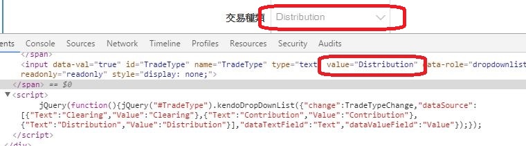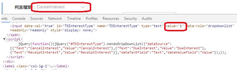 <input data-val="true" id="TradeType" name="TradeType" type="text" value="Distribution" data-role="dropdownlist" readonly="readonly" style="display: none;"><script> jQuery(function(){jQuery("#TradeType").kendoDropDownList({"change":TradeTypeChange,"dataSource":[{"Text":"Clearing","Value":"Clearing"},{"Text":"Contribution","Value":"Contribution"},{"Text":"Distribution","Value":"Distribution"}],"dataTextField":"Text","dataValueField":"Value"});});</script>Second, it shows value="1", so it will select wrong value. The correct value should be "DueInterest".