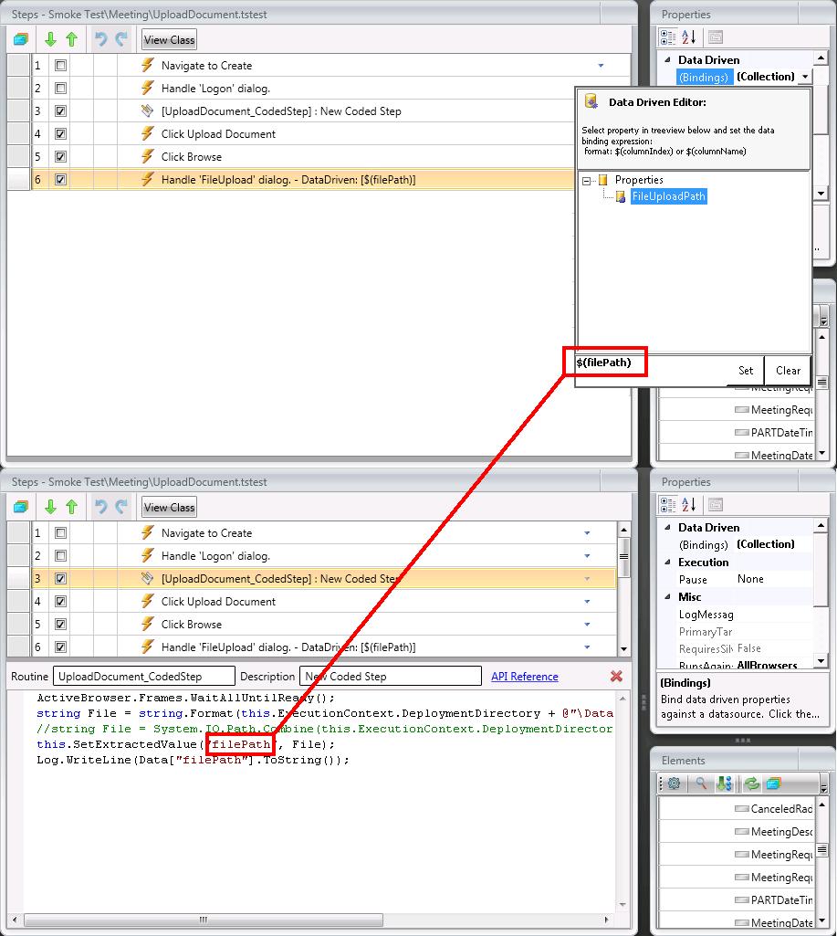 string File = System.IO.Path.Combine(this.ExecutionContext.DeploymentDirectory, @"\Data\DataSource.xlsx"); SetExtractedValue("File", File); Log.WriteLine(Data["File"].ToString()); Doesn't work. The deployment directory of the test is not found. the Log Result is empty.