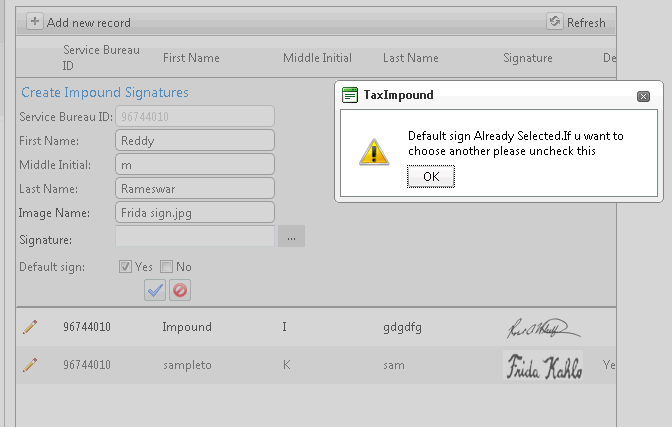 RadWindowManager1.RadAlert("Default sign Already Selected.If u want to choose another please uncheck this", 330, 100, "TaxImpound", "");