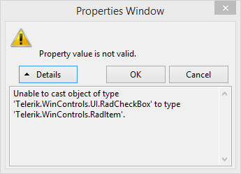 we got a pretty infuriating problem with Telerik for WinForms. We don't know why but the project started to producing errors when renaming RadControls: "Property value is not valid." (see attached screenshot). The renaming is still done, but the code for the old name is still left behind in the designer. So if I add a checkbox, it gets the name "radCheckBox1" and rename it to "radCheckBoxUser", the error will pop up and code for both will stay in the designer code. Also, if I create an event via the property window in VS for radCheckBoxUser, it will still reference the old checkbox and create a "radCheckBox1_ToggleStateChanged" event. So almost every time we add or change a control, we have to clean up designer code and code behind, which is too time consuming.
