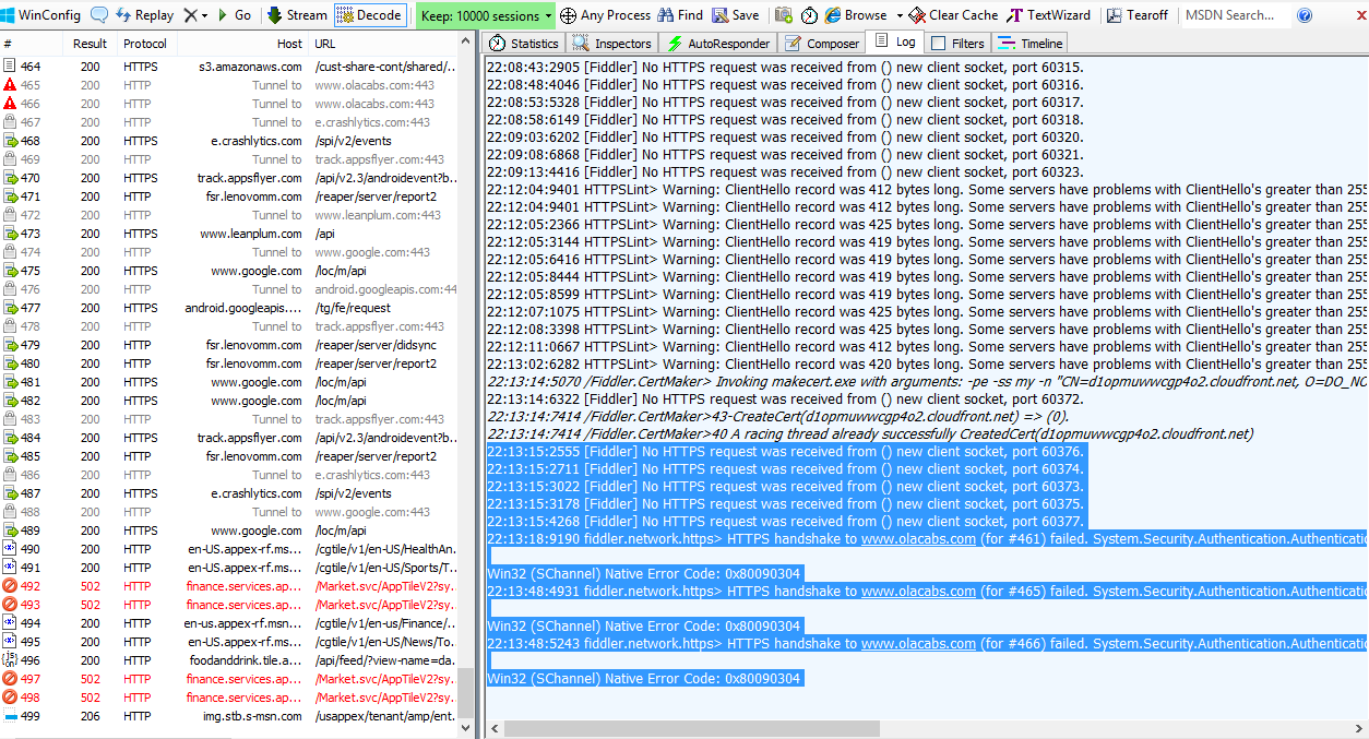 22:13:48:4931 fiddler.network.https> HTTPS handshake to www.olacabs.com (for #465) failed. System.Security.Authentication.AuthenticationException A call to SSPI failed, see inner exception. < The Local Security Authority cannot be contacted
