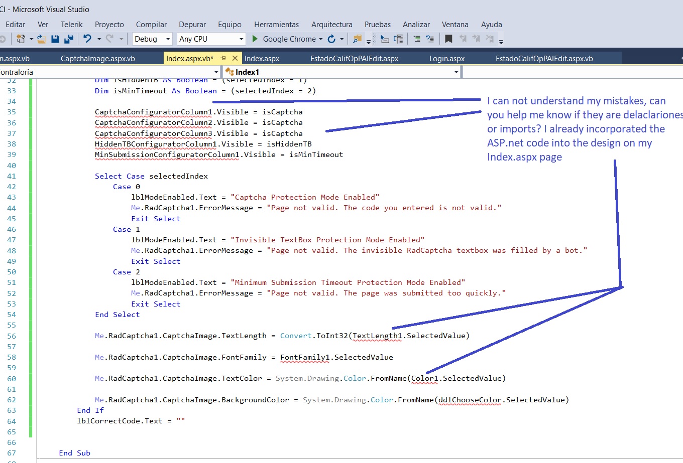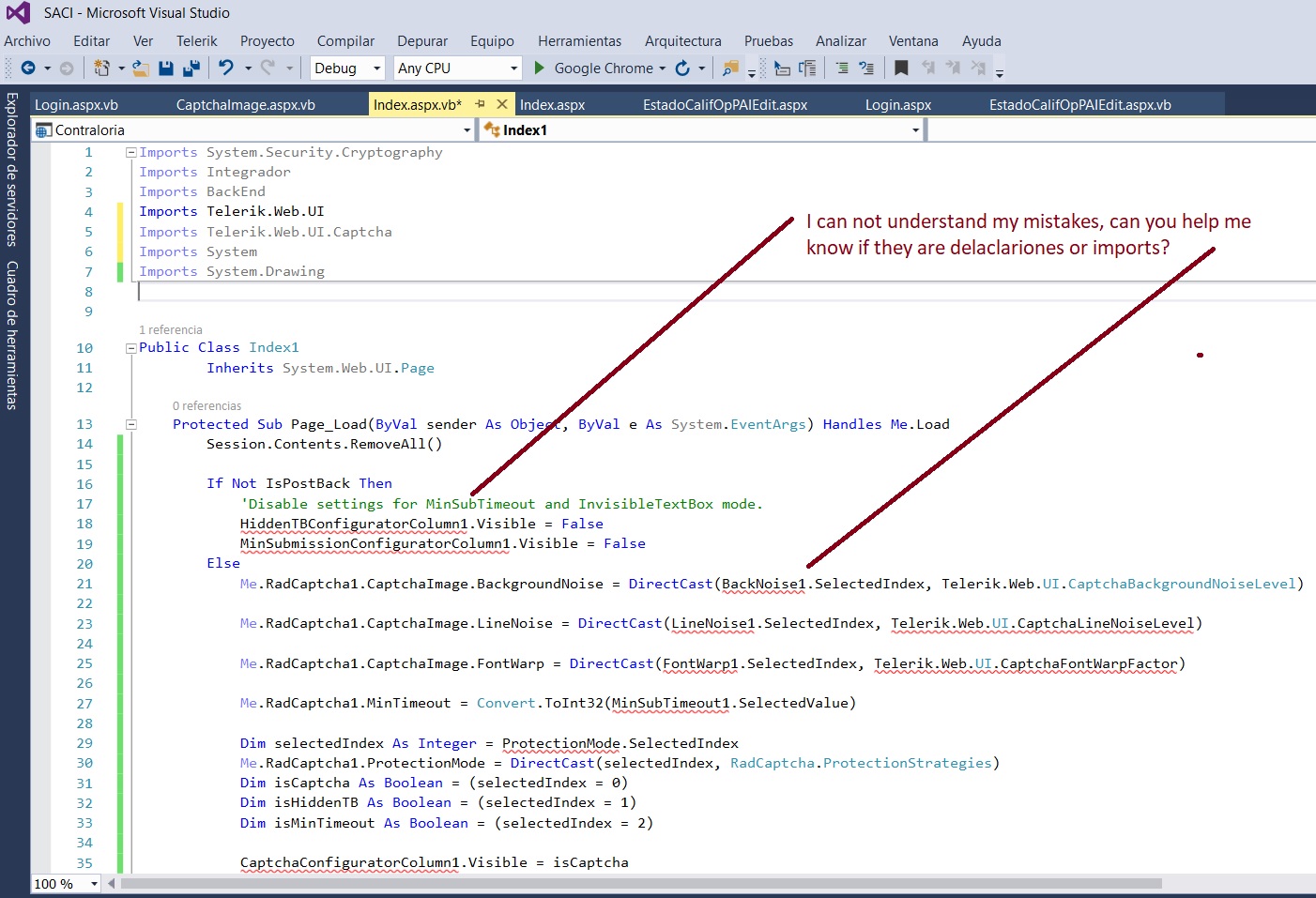 I can not understand my mistakes, can you help me know if they are delaclariones or imports? I already incorporated the ASP.net code in the design on my Index.aspx page, but when I added the aspx.vb code (visual Basic) I got errors. (attached image)