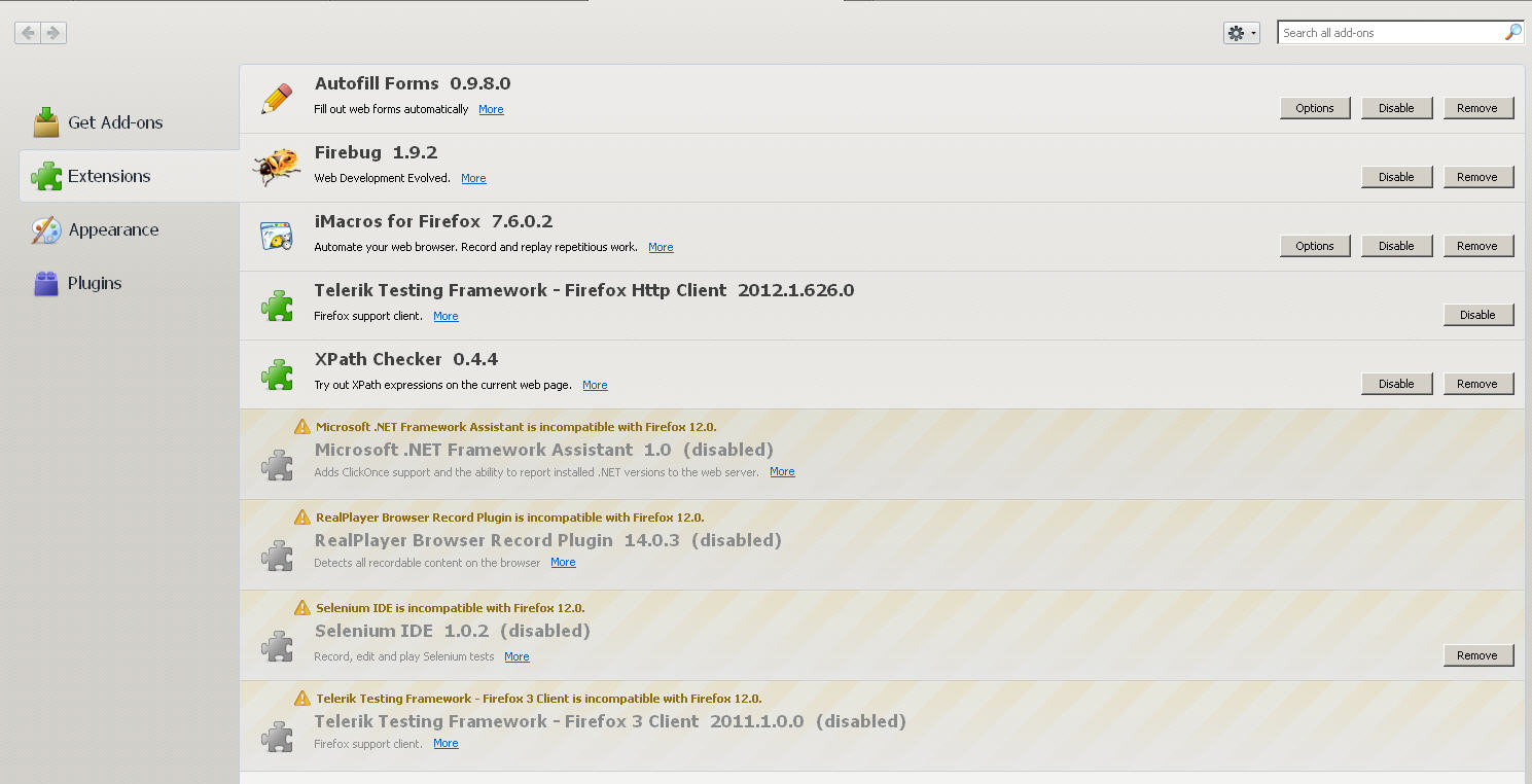 I'm using FF 12.0 and I have noticed the error message after installing 'Telerik_Testing_Framework_2012_1_719_FREE_EDITION.msi'