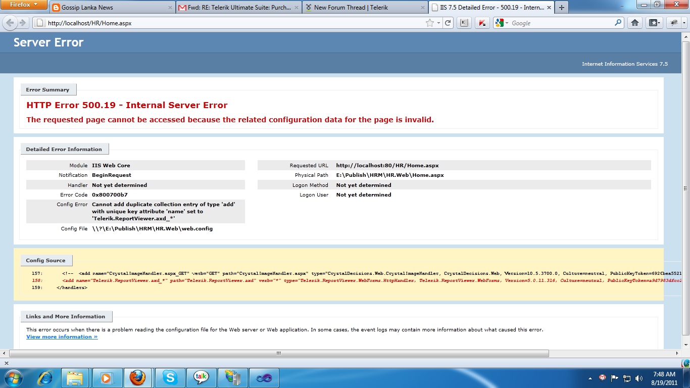 I Have a solution with 4 web site in it (same solution). every web project use reporting. I'm try to host it on IIS 7 . i create site on iis and give path of my first web project. then other web project add as web application to that site in iis. problem is wen I run the site its give me this error in web config files of each projects which i add them as web applications (error screen is attached).
