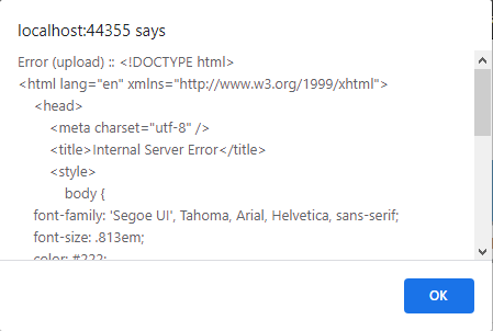When the Upload is in async mode and the upload or remove operation fails the error event is triggered. As the save handler is expected to return either an empty response or JSON string with "text/plain" content encoding in event of success, returning anything else would signify that an error with the operation has occurred. Having said that you can further change the response returned from the action method to signify an error, for example: