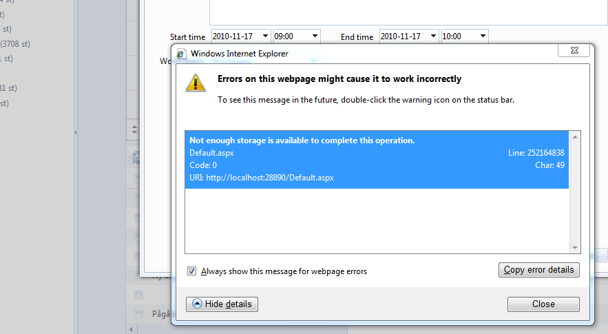 But when I have an AjaxSetting between the tree view and the scheduler so that only the scheduler reloads when I click on my node and after that open an appointment in the edit dialog I get an error. The error I get is "There is not enough storage to complete this operation".