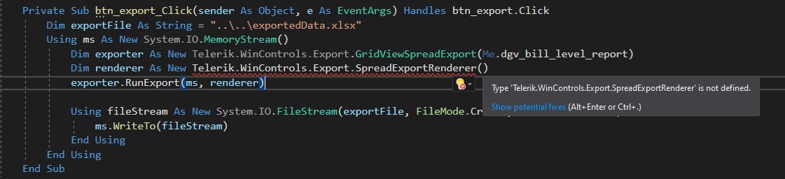 My issue is when I try to export the RadGridView data to excel I cant compile.