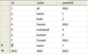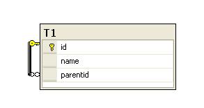 CREATE TABLE [dbo].[T1]( [id] [int] NOT NULL, [name] [nvarchar](50) COLLATE Arabic_CI_AS NULL, [parentid] [int] NULL, CONSTRAINT [PK_T1] PRIMARY KEY CLUSTERED ( [id] ASC)WITH (PAD_INDEX = OFF, STATISTICS_NORECOMPUTE = OFF, IGNORE_DUP_KEY = OFF, ALLOW_ROW_LOCKS = ON, ALLOW_PAGE_LOCKS = ON) ON [PRIMARY]) ON [PRIMARY]GOALTER TABLE [dbo].[T1] WITH CHECK ADD CONSTRAINT [FK_T1_T1] FOREIGN KEY([parentid])REFERENCES [dbo].[T1] ([id])GOALTER TABLE [dbo].[T1] CHECK CONSTRAINT [FK_T1_T1]