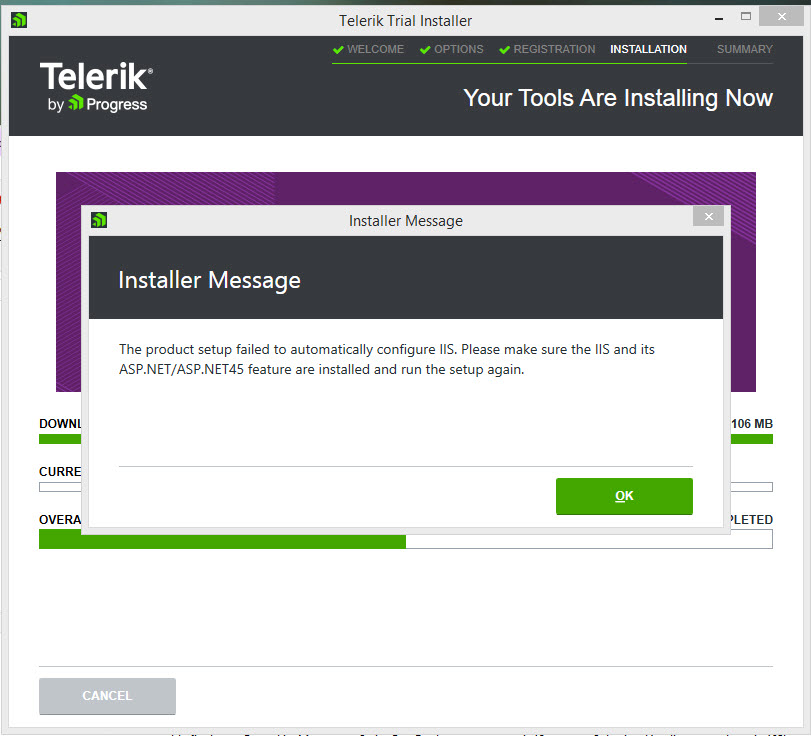 I've just downloaded Telerik's reporting products and during the installation I've hit a problem with Report Server. I'm running Windows 8, with IIS 10 express I believe and .Net 4.6