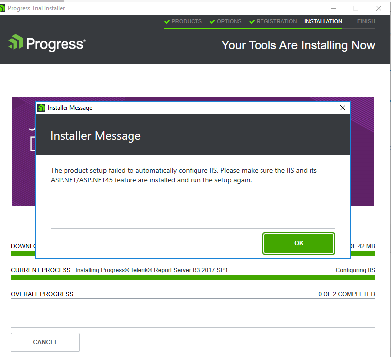 We are challeged by the same issue - we have downloaded the trial of Telerik Reporting server (running on a MS Server2016) and is unable to complete the installation as it states that either IIS og ASP.NET 4.5 is not installed/working. I can confirm that IIS is running and we have ASP.NET 4.6 installed. Kindly advice means to complete installation, thanks.