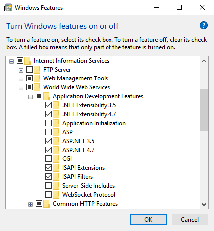 Internet Information Services need to have the .NET-related features checked in the Windows Features dialog box as shown below: