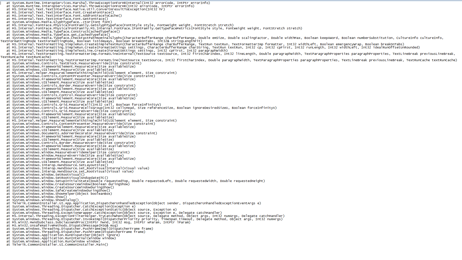 Still, we've examined the logs you sent us and our guess is that this is kind of WPF runtime problem (we can't be more specific). If you have another machine available, you can try to run the application and check if the result differs.