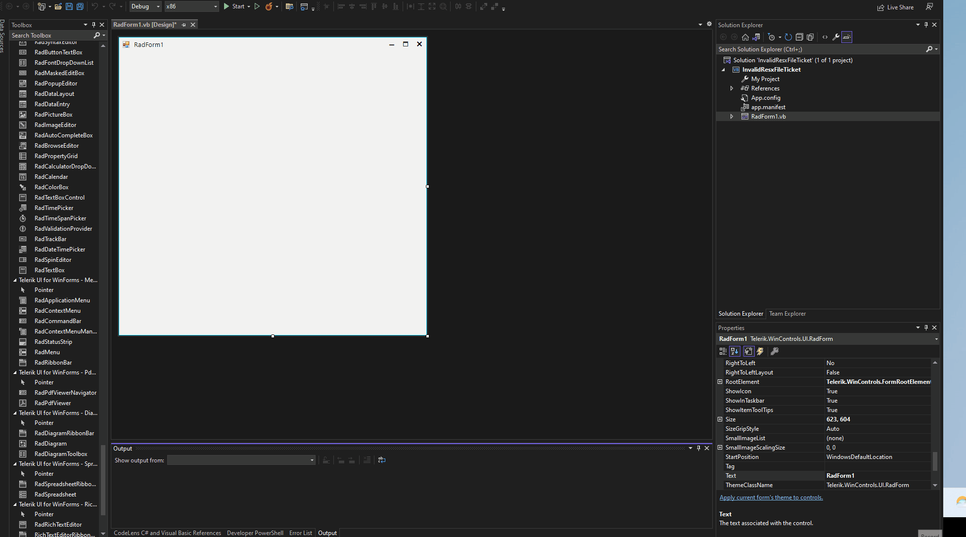 Invalid Resx file. Could not load type System.DelegateSerializationHolder, Telerik.WinControls.UI, Version=2022.2.622.40, Culture=neutral, PublicKeyToken=5bb2a467cbec794e which is used in the .RESX file. Ensure that the necessary references have been added to your project. Line 4694, position 5.