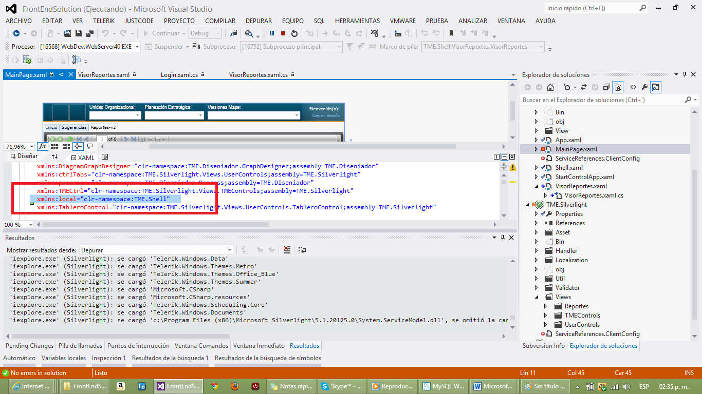 Hello, I'm working with a solution containing silverlight projects and need to integrate a report viewer, I add the user control and all without problems, but when you run the project, to load the user control that contains the ReportViewer me is launching this exception, which is not a data type, so what is strange since the ReportViewer is empty yet. Anyone can help me solve it? Deputy images.