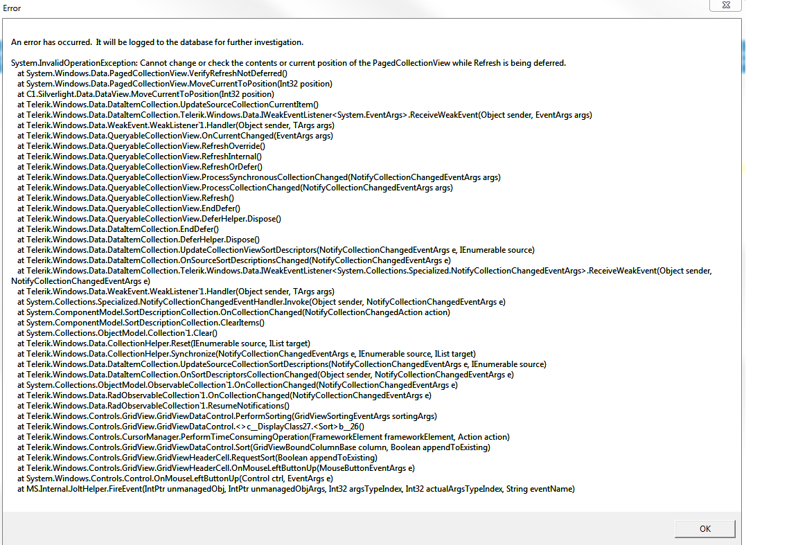 I have run into an unusual error. I have a grid with a number of columns in it, one of which is a hyperlink bringing up a dialog that is subsequently closed leading to the issue. After this dialog is closed the frist click on a column header leads to an error. This does not happen eother before the dialog is broght up or after the error is generated the first time. The dialog receives a link to the dataset behind the grid. A Dialogs that does not reference the dataset does not genate the issue. I use a custome class defined to pass a parameter