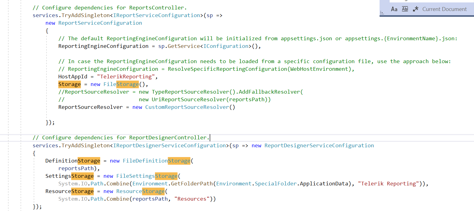 You can change the default folder using the second overload of the FileStorage and passing the custom folder location. The changes need to be made in ReportsController.cs file where the settings of the Reporting REST service are defined. Please refer to this excellent knowledge base article for an example - Error registering the viewer with the service. Access to path X is denied.