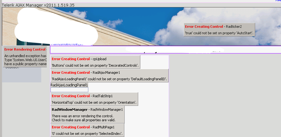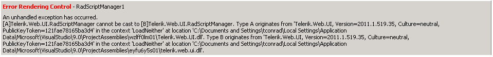 My company just purchased the Developer license for the ASP.NET version 2011.1.519.35 control set. After complete removal of the trial version and re-installation of the purchased product I am now receiving the error in the attached controlerror.png file. I removed all instances of Telerik from the web.config during the removal of the Trial version. I then copied the new telerik.web.ui.dll and placed it into the solution libary folder and references that dll in the solution. I then ran the 'configure project' selection from Telerik menu to bring my web.config into compliance for this version. No existing controls in the project will render either all controls are showing different errors ( see attached Page1Errors.png) any help would be appreciated.