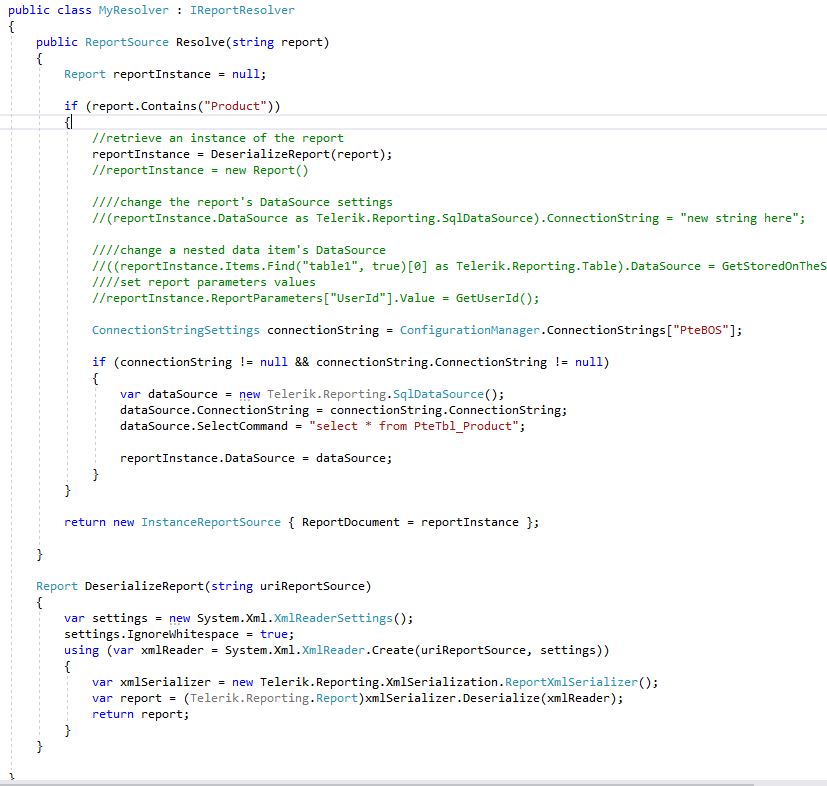 Deserialization will only be required for XML report definitions (TRDP or TRDX reports). In your scenario, the report is specified by its assembly-qualified name which means that it is designed in Visual Studio report designer. Therefore, you can work directly with report class inside custom report resolver, for example: