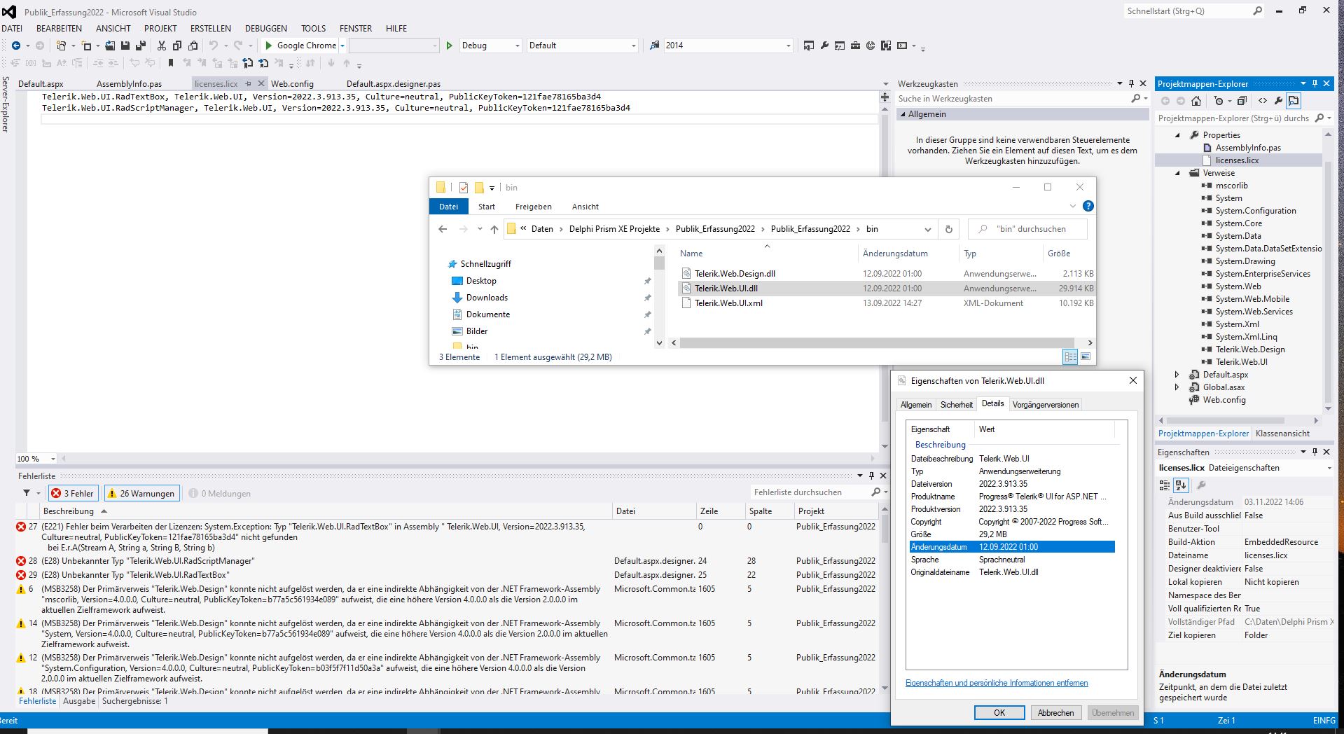 Meanwhile, try to remove the references to the Telerik assemblies and to re-add them to point to the assemblies from the same installation. If the project is running .NET 4.0, go to the bin40 installation folder and obtain the Telerik.Web.UI.dll from it.