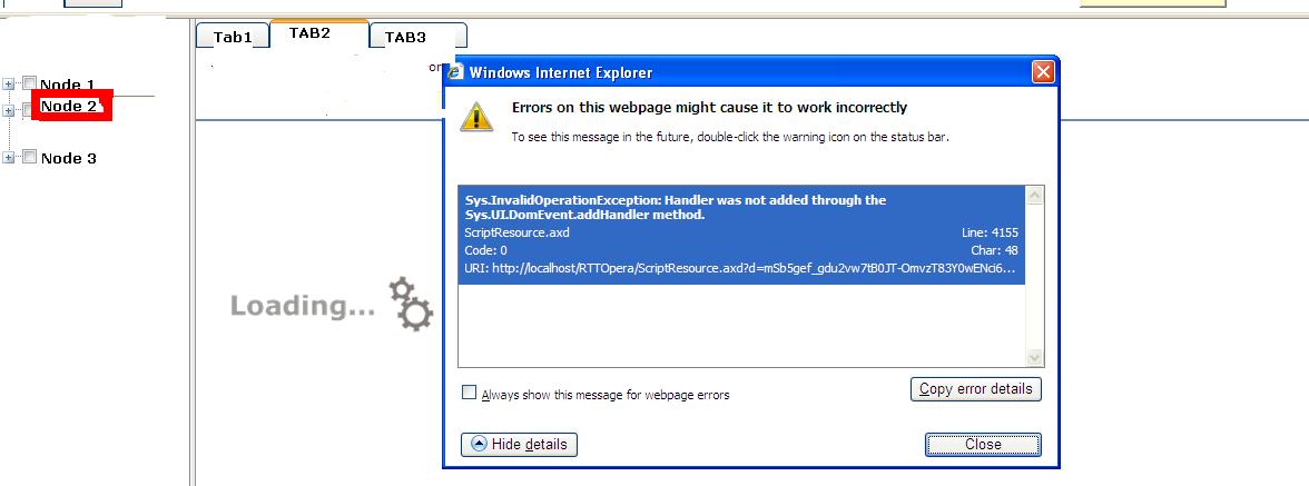 1) Click on any Tree view Node OR on Multiple Tabs, the Ajax control keeps on Loading and generates below javascript error: