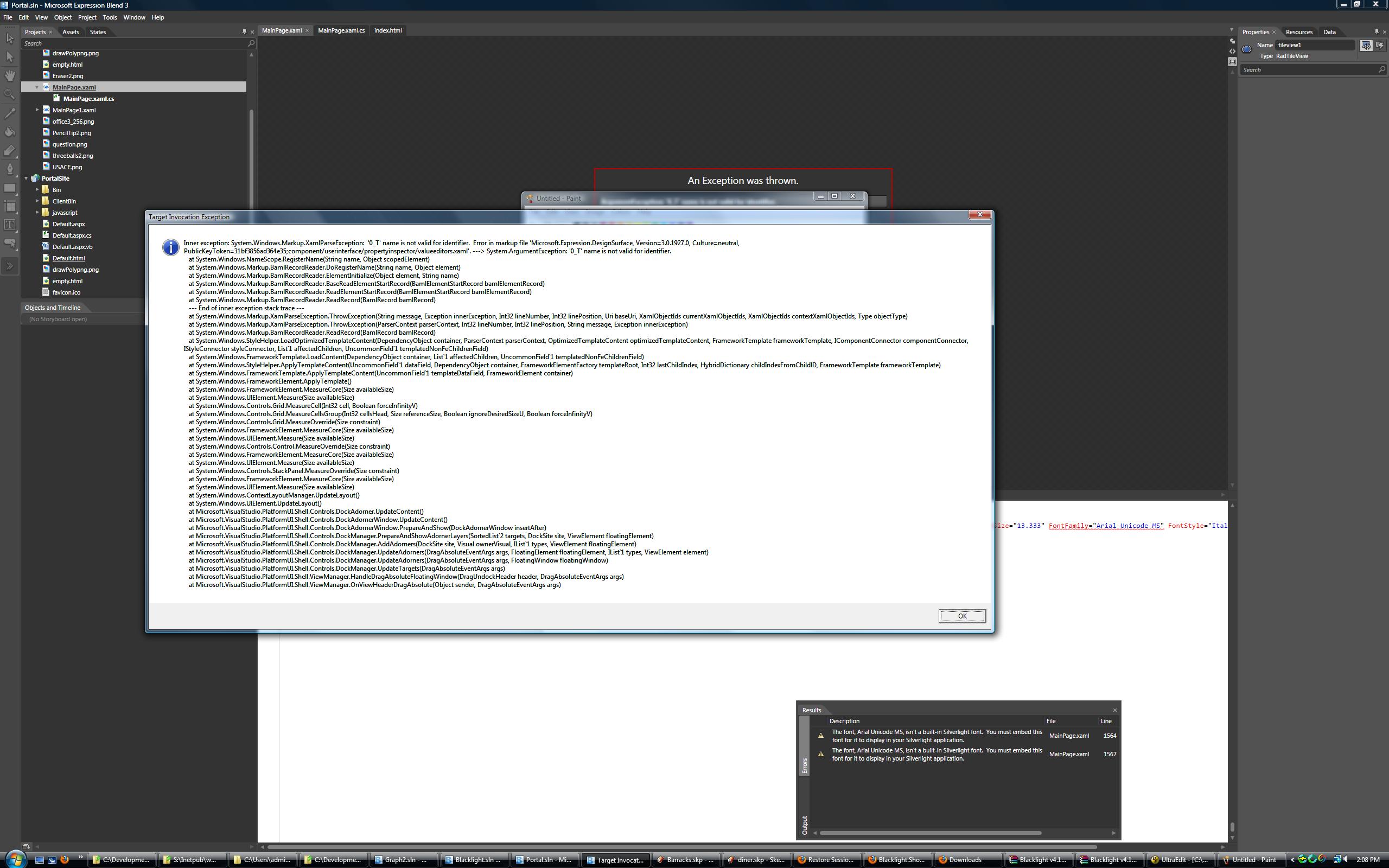 I tried to create a simple Silverlight/Web App using Blend 3. When I drag the radtileview control onto the canvas it draws as expected. The problem occurs when I try to modify anything associated with the tileview control. For example, if I click on miscellaneous under the properties tab it locks up expression blend. After, clicking around for a while it will finally comes back with an exception.