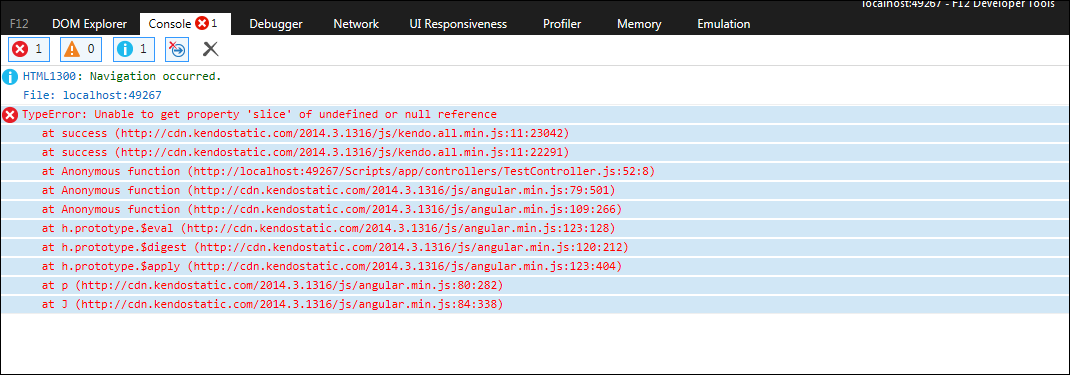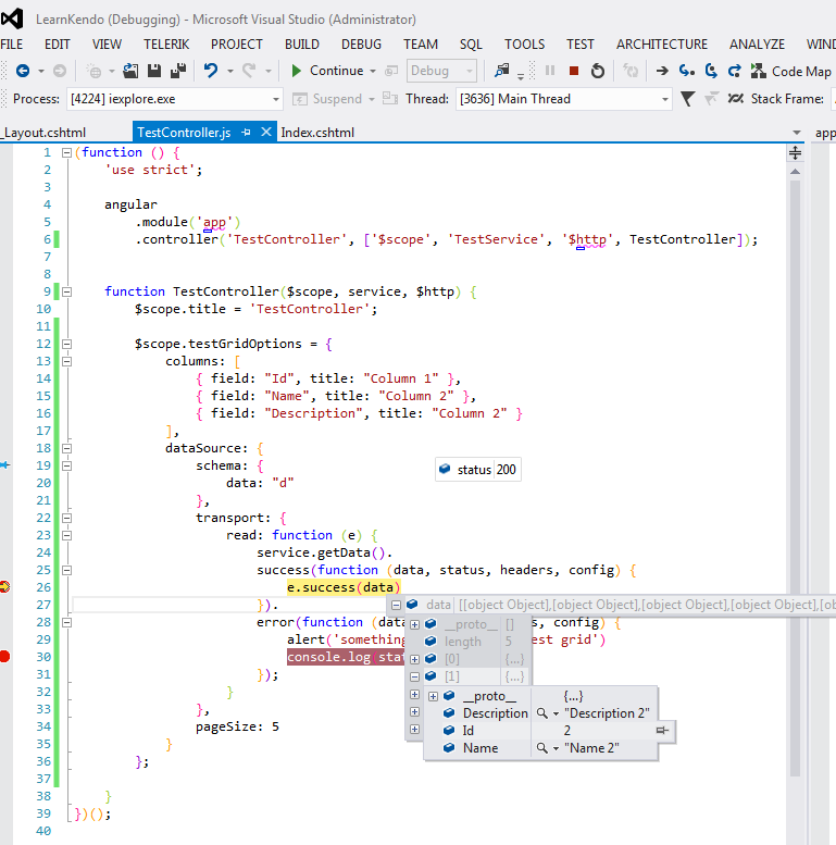 (function () { 'use strict'; angular .module('app') .controller('TestController', ['$scope', 'TestService', '$http', TestController]); function TestController($scope, service, $http) { $scope.title = 'TestController'; $scope.testGridOptions = { columns: [ { field: "Id", title: "Column 1" }, { field: "Name", title: "Column 2" }, { field: "Description", title: "Column 2" } ], dataSource: { schema: { data: "d" }, transport: { read: function (e) { service.getData(). success(function (data, status, headers, config) { e.success(data) }). error(function (data, status, headers, config) { alert('something went wrong in test grid') console.log(status); }); } }, pageSize: 5 } }; }})();Index.cshtml