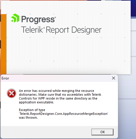 Error of type 'Telerik.ReportDesigner.Core.AppResourceMergeException' was thrown."