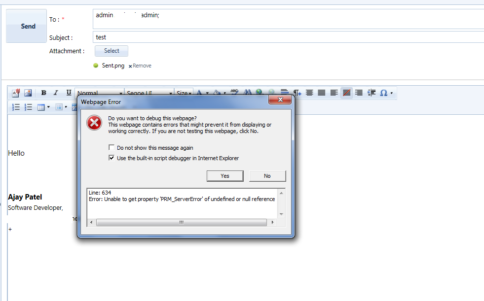 When I send Mail without attachment then it works fine. but when I attach document and then send then it throw error of PRM_server.