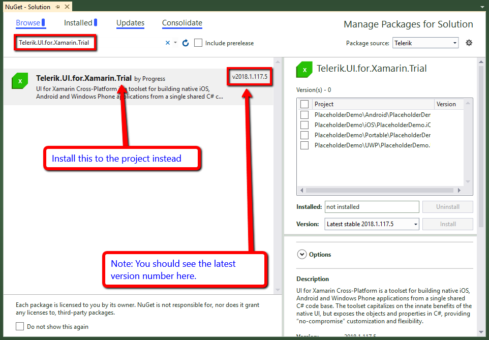 Once you obtain a license (trial or paid), you'll be able to then see the Xamarin packages in the Telerik NuGet feed (note that if you are assigned a trial license, you'll need to switch to the Trial NuGet package).