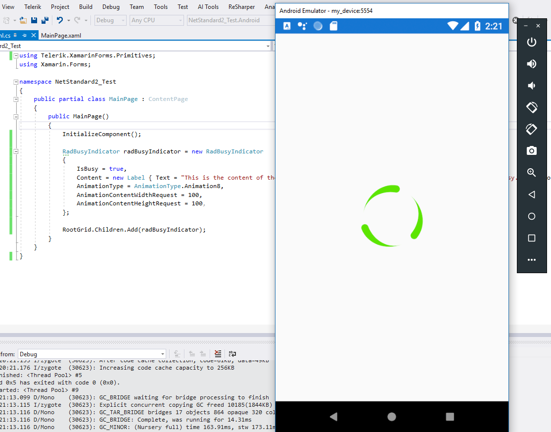 using Telerik.XamarinForms.Primitives;using Xamarin.Forms;namespace NetStandard2_Test{ public partial class MainPage : ContentPage { public MainPage() { InitializeComponent(); RadBusyIndicator radBusyIndicator = new RadBusyIndicator { IsBusy = true, Content = new Label { Text = "This is the content of the RadBusyIndicator control displayed when the indicator is not busy.", TextColor = Color.Black }, AnimationType = AnimationType.Animation8, AnimationContentWidthRequest = 100, AnimationContentHeightRequest = 100, }; RootGrid.Children.Add(radBusyIndicator); } }}Here's the result at runtime: