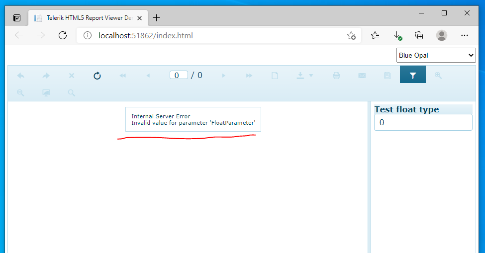 We have Float type parameter in our report. Default value of the parameter is zero. When we preview this report on Standalone Designer it works fine (see WhenRunningOnStandaloneReportDesigner.PNG), but when we preview this report on Html5 Report Viewer it shows error (see ErrorWhenRunningOnHtml5ReportViewer.PNG, Internal Server Error