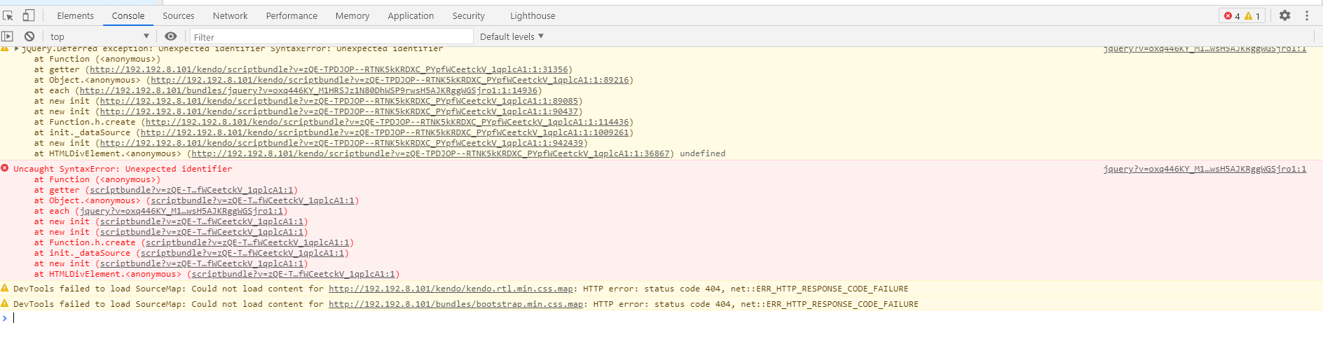 I have also attached screen shot for console Error and my Code to bind Kendo Grid.