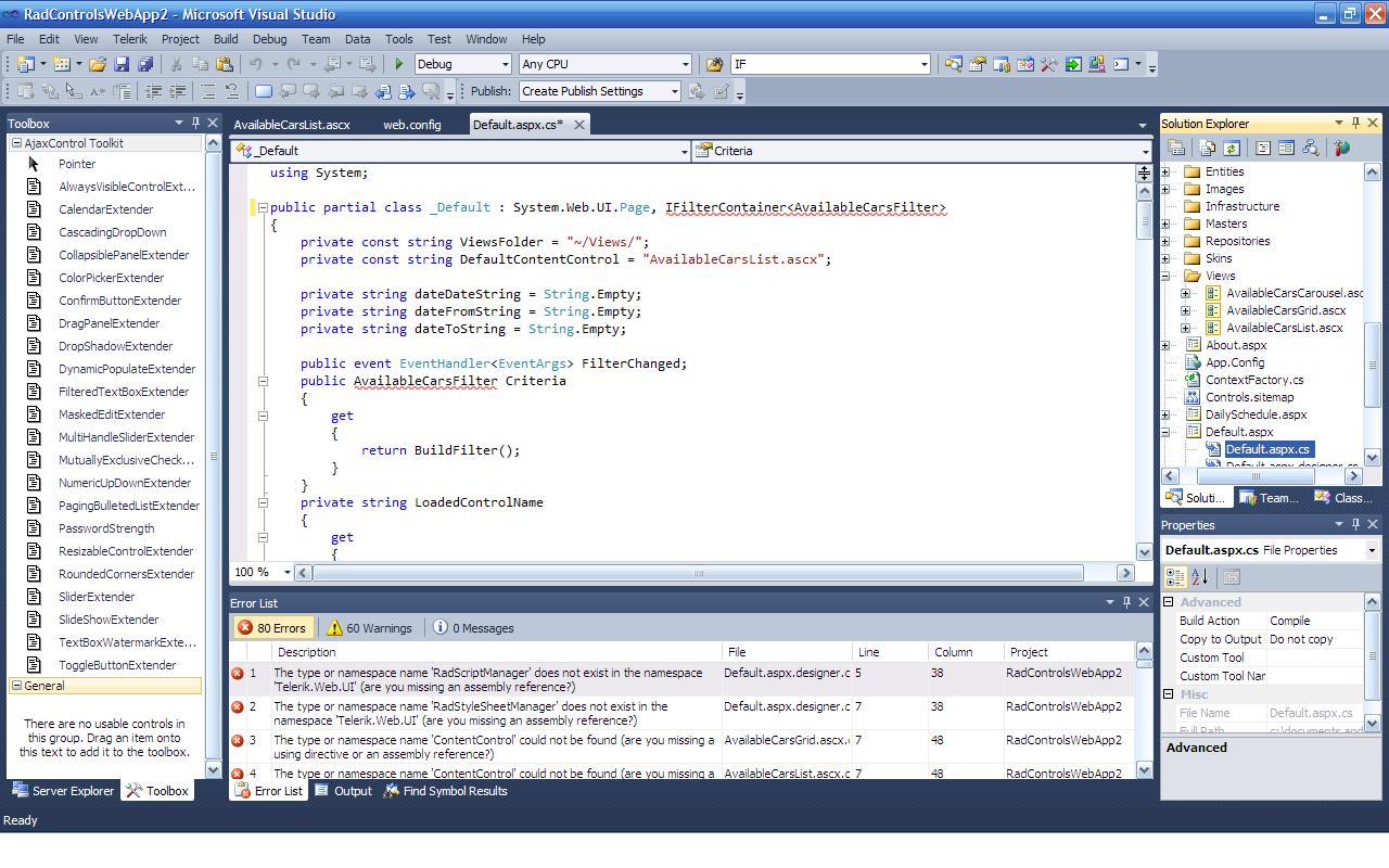 I downloaded a source code for a demo available on telerik's website which uses ASP.net AJAX, when I try to run it on my pc it gives me alot of errors, tried to fix them by adding the references again but still errors are coming. The problem is referring to a function in another class is not working. This is a picture of what is happening.