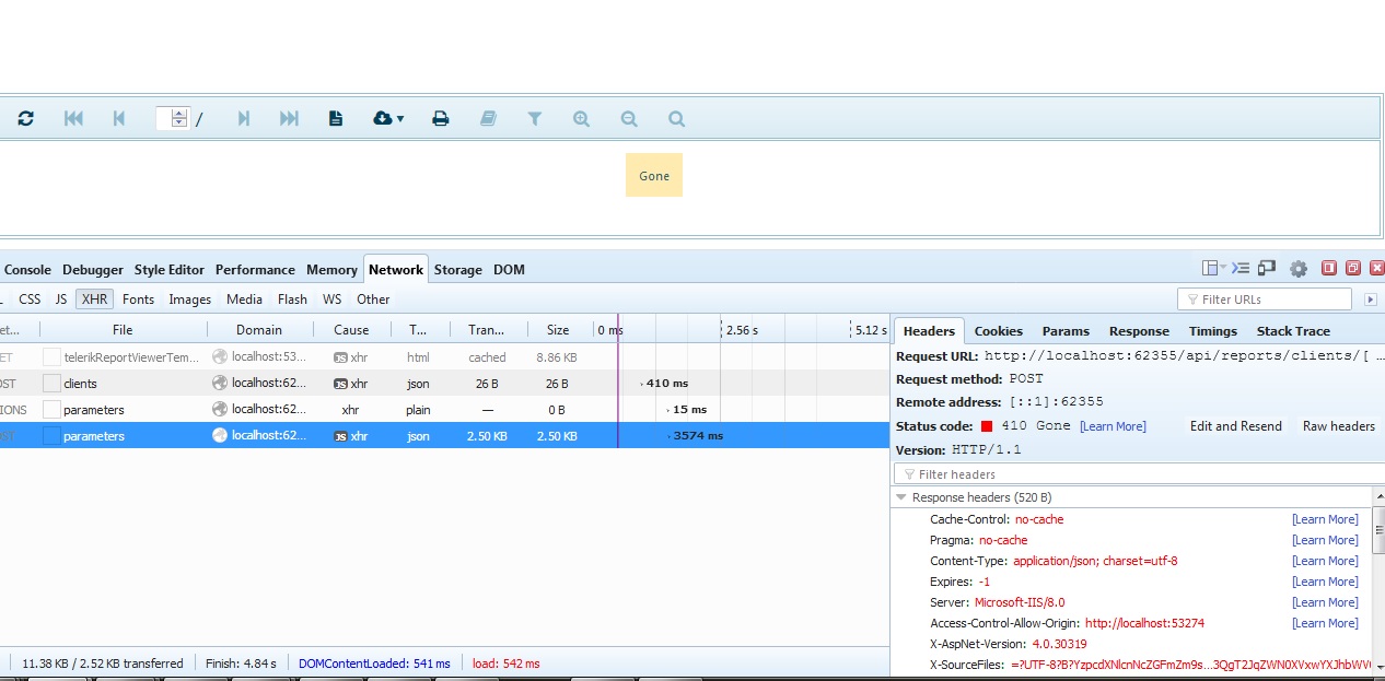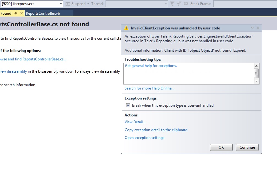 When I open "Report.aspx" it throws an error "Client with ID '[object Object]' not found. Expired" on locally running Service App (See attached image "ServiceError.jpg"). At the same time client side(Web App page Report.aspx) shows an alert message "Gone" (See Image 410_Gone.jpg). ReportsController.vb code is as follows: