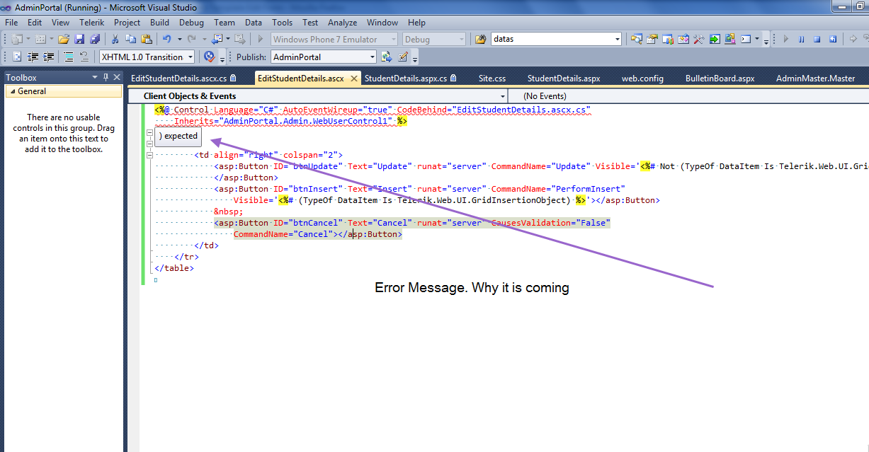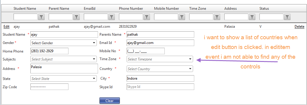 <%@ Control Language="C#" AutoEventWireup="true" CodeBehind="EditStudentDetails.ascx.cs" Inherits="AdminPortal.Admin.WebUserControl1" %><table> <tr> <td align="right" colspan="2"> <asp:Button ID="btnUpdate" Text="Update" runat="server" CommandName="Update" Visible='<%# Not (TypeOf DataItem Is Telerik.Web.UI.GridInsertionObject) %>'> </asp:Button> <asp:Button ID="btnInsert" Text="Insert" runat="server" CommandName="PerformInsert" Visible='<%# (TypeOf DataItem Is Telerik.Web.UI.GridInsertionObject) %>'></asp:Button> <asp:Button ID="btnCancel" Text="Cancel" runat="server" CausesValidation="False" CommandName="Cancel"></asp:Button> </td> </tr></table><%@ Page Title="" Language="C#" MasterPageFile="~/Admin/AdminMaster.Master" AutoEventWireup="true" CodeBehind="StudentDetails.aspx.cs" Inherits="AdminPortal.Admin.StudentDetails" %><asp:Content ID="Content1" ContentPlaceHolderID="head" runat="server"></asp:Content><asp:Content ID="Content2" ContentPlaceHolderID="ContentPlaceHolder1" runat="server"> <%--<telerik:RadScriptManager ID="RadScriptManager1" runat="server" />--%> <!-- content start --> <telerik:RadAjaxManager ID="RadAjaxManager1" runat="server"> <AjaxSettings> <telerik:AjaxSetting AjaxControlID="RadGrid1"> <UpdatedControls> <telerik:AjaxUpdatedControl ControlID="RadGrid1" LoadingPanelID="RadAjaxLoadingPanel1" /> </UpdatedControls> </telerik:AjaxSetting> </AjaxSettings> </telerik:RadAjaxManager> <telerik:RadAjaxLoadingPanel ID="RadAjaxLoadingPanel1" runat="server" /> <telerik:RadCodeBlock runat="server" ID="radCodeBlock"> <script type="text/javascript"> function showFilterItem() { $find('<%=RadGrid1.ClientID %>').get_masterTableView().showFilterItem(); } function hideFilterItem() { $find('<%=RadGrid1.ClientID %>').get_masterTableView().hideFilterItem(); } function RowDblClick(sender, eventArgs) { sender.get_masterTableView().editItem(eventArgs.get_itemIndexHierarchical()); } </script> </telerik:RadCodeBlock> <telerik:RadGrid ID="RadGrid1" runat="server" GridLines="None" AllowPaging="True" DataSourceID="EntityDataSource1" AllowSorting="True" AutoGenerateColumns="False" ShowStatusBar="true" CssClass="RadGrid"> <MasterTableView Width="100%" DataKeyNames="StudentID"> <Columns> <telerik:GridEditCommandColumn UniqueName="EditCommandColumn"> </telerik:GridEditCommandColumn> <telerik:GridBoundColumn DataField="StudentID" DataType="System.Int32" HeaderText="StudentID" ReadOnly="True" SortExpression="StudentID" UniqueName="StudentID" Visible="false"> </telerik:GridBoundColumn> <telerik:GridBoundColumn DataField="StudentName" HeaderText="StudentName" SortExpression="StudentName" UniqueName="StudentName"> </telerik:GridBoundColumn> <telerik:GridBoundColumn DataField="ParentsName" HeaderText="ParentsName" SortExpression="ParentsName" UniqueName="ParentsName"> </telerik:GridBoundColumn> <telerik:GridBoundColumn DataField="Gender" HeaderText="Gender" SortExpression="Gender" UniqueName="Gender" Visible="false"> </telerik:GridBoundColumn> <telerik:GridBoundColumn DataField="EmailId" HeaderText="EmailId" SortExpression="EmailId" UniqueName="EmailId"> </telerik:GridBoundColumn> <telerik:GridBoundColumn DataField="PhoneNumber" HeaderText="PhoneNumber" SortExpression="PhoneNumber" UniqueName="PhoneNumber"> </telerik:GridBoundColumn> <telerik:GridBoundColumn DataField="MobileNumber" HeaderText="MobileNumber" SortExpression="MobileNumber" UniqueName="MobileNumber"> </telerik:GridBoundColumn> <telerik:GridBoundColumn DataField="Subject" HeaderText="Subject" SortExpression="Subject" UniqueName="Subject" Visible="false"> </telerik:GridBoundColumn> <telerik:GridBoundColumn DataField="TimeZone" HeaderText="TimeZone" SortExpression="TimeZone" UniqueName="TimeZone"> </telerik:GridBoundColumn> <telerik:GridBoundColumn DataField="Address" HeaderText="Address" SortExpression="Address" UniqueName="Address"> </telerik:GridBoundColumn> <telerik:GridBoundColumn DataField="Country" HeaderText="Country" SortExpression="Country" UniqueName="Country" Visible="false"> </telerik:GridBoundColumn> <telerik:GridBoundColumn DataField="State" HeaderText="State" SortExpression="State" UniqueName="State" Visible="false"> </telerik:GridBoundColumn> <telerik:GridBoundColumn DataField="City" HeaderText="City" SortExpression="City" UniqueName="City" Visible="false"> </telerik:GridBoundColumn> <telerik:GridBoundColumn DataField="ZipCode" HeaderText="ZipCode" SortExpression="ZipCode" UniqueName="ZipCode" Visible="false"> </telerik:GridBoundColumn> <telerik:GridBoundColumn DataField="SkypeId" HeaderText="SkypeId" SortExpression="SkypeId" UniqueName="SkypeId" Visible="false"> </telerik:GridBoundColumn> <telerik:GridBoundColumn DataField="Status" HeaderText="Status" SortExpression="Status" UniqueName="Status" Visible="false"> </telerik:GridBoundColumn> <telerik:GridButtonColumn UniqueName="DeleteColumn" Text="Delete" CommandName="Delete" /> </Columns> <EditFormSettings UserControlName="EditStudentDetails.ascx" EditFormType="WebUserControl"> <EditColumn UniqueName="EditCommandColumn1"> </EditColumn> </EditFormSettings> <ExpandCollapseColumn ButtonType="ImageButton" Visible="False" UniqueName="ExpandColumn"> <HeaderStyle Width="19px"></HeaderStyle> </ExpandCollapseColumn> </MasterTableView> <ClientSettings> <ClientEvents OnRowDblClick="RowDblClick" /> </ClientSettings> </telerik:RadGrid> <%--<telerik:RadGrid AutoGenerateColumns="false" ID="RadGrid1" DataSourceID="EntityDataSource1" AllowFilteringByColumn="True" AllowSorting="True" CssClass="RadGrid" GridLines="None" AllowPaging="True" PageSize="20" runat="server" EnableLinqExpressions="false" Width="500px" OnItemDeleted="RadGrid1_ItemDeleted" OnItemUpdated="RadGrid1_ItemUpdated" OnItemCommand="RadGrid1_ItemCommand" OnPreRender="RadGrid1_PreRender"> <PagerStyle Mode="NextPrevAndNumeric" ShowPagerText="true" /> <GroupingSettings CaseSensitive="false" /> <MasterTableView AutoGenerateColumns="false" AllowFilteringByColumn="True" TableLayout="Auto" DataKeyNames="StudentID" DataSourceID="EntityDataSourc