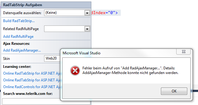 Hi, when I try to add RadAjaxManager through a controls smarttag I always get an error message (please see attached file).The error message is from a german version of VS2010, it basically means "Error while calling "Add RadAjaxManager...AddAjaxManager method can not be found).