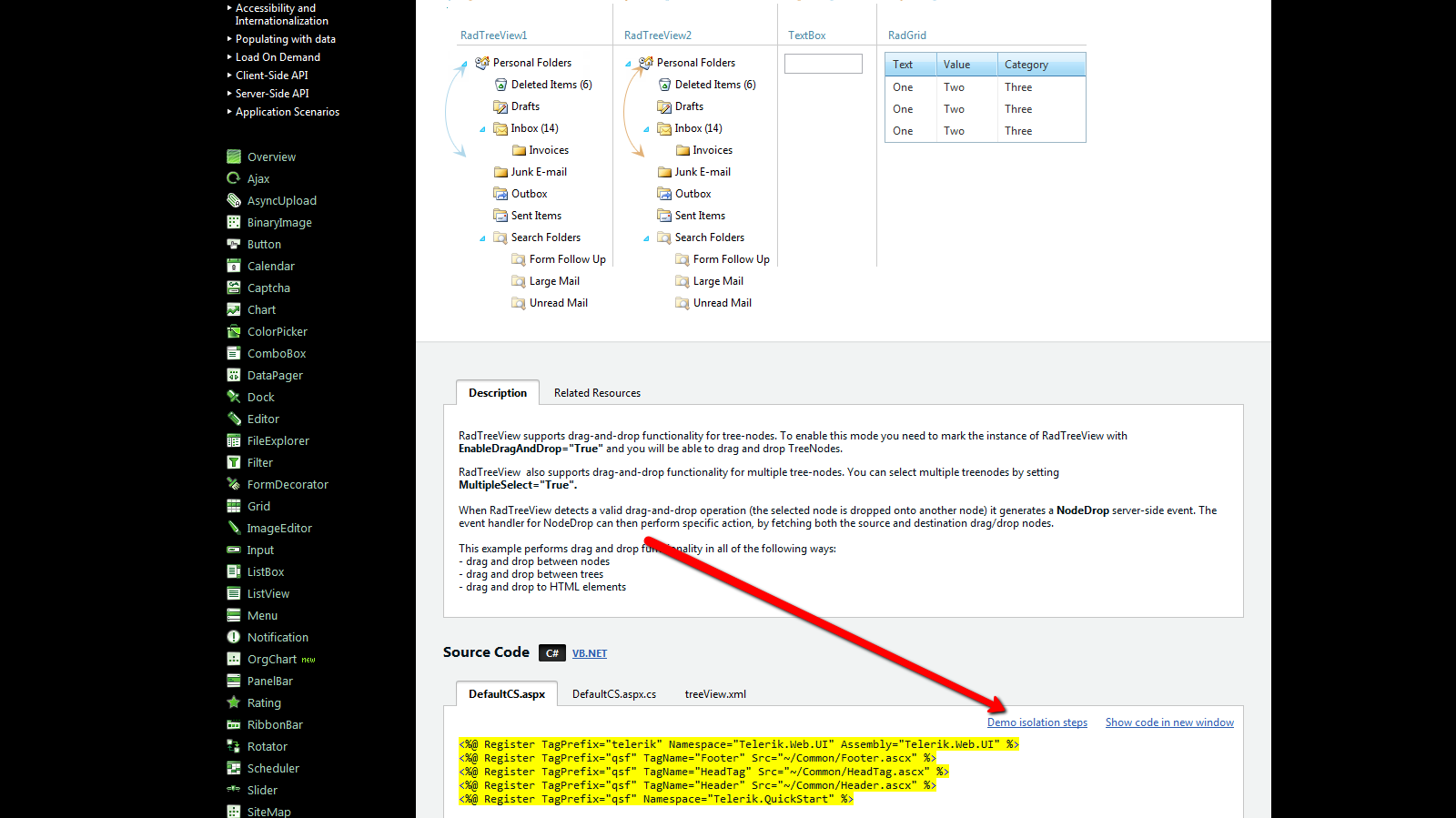 <%@ Control Language="vb" AutoEventWireup="false" CodeBehind="wucDrag-Drop.ascx.vb" Inherits="EasyTask_UI.wucDrag_Drop" %><%@ Register TagPrefix="telerik" Namespace="Telerik.Web.UI" Assembly="Telerik.Web.UI" %> <telerik:RadScriptBlock runat="Server" ID="RadScriptBlock1"> <script type="text/javascript"> /* <![CDATA[ */ var gridId = "<%= RadGrid1.ClientID %>"; function isMouseOverGrid(target) { parentNode = target; while (parentNode != null) { if (parentNode.id == gridId) { return parentNode; } parentNode = parentNode.parentNode; } return null; } function onNodeDragging(sender, args) { var target = args.get_htmlElement(); if(!target) return; if (target.tagName == "INPUT") { target.style.cursor = "hand"; } var grid = isMouseOverGrid(target) if (grid) { grid.style.cursor = "hand"; } } function dropOnHtmlElement(args) { if(droppedOnInput(args)) return; if(droppedOnGrid(args)) return; } function droppedOnGrid(args) { var target = args.get_htmlElement(); while(target) { if(target.id == gridId) { args.set_htmlElement(target); return; } target = target.parentNode; } args.set_cancel(true); } function droppedOnInput(args) { var target = args.get_htmlElement(); if (target.tagName == "INPUT") { target.style.cursor = "default"; target.value = args.get_sourceNode().get_text(); args.set_cancel(true); return true; } } function dropOnTree(args) { var text = ""; if(args.get_sourceNodes().length) { var i; for(i=0; i < args.get_sourceNodes().length; i++) { var node = args.get_sourceNodes()[i]; text = text + ', ' +node.get_text(); } } } function clientSideEdit(sender, args) { var destinationNode = args.get_destNode(); if(destinationNode) { var firstTreeView = $find('RadTreeView1'); firstTreeView.trackChanges(); var sourceNodes = args.get_sourceNodes(); for (var i = 0; i < sourceNodes.length; i++) { var sourceNode = sourceNodes[i]; sourceNode.get_parent().get_nodes().remove(sourceNode); if(args.get_dropPosition() == "over") destinationNode.get_nodes().add(sourceNode); if(args.get_dropPosition() == "above") insertBefore(destinationNode, sourceNode); if(args.get_dropPosition() == "below") insertAfter(destinationNode, sourceNode); } destinationNode.set_expanded(true); firstTreeView.commitChanges(); } } function insertBefore(destinationNode, sourceNode) { var destinationParent = destinationNode.get_parent(); var index = destinationParent.get_nodes().indexOf(destinationNode); destinationParent.get_nodes().insert(index, sourceNode); } function insertAfter(destinationNode, sourceNode) { var destinationParent = destinationNode.get_parent(); var index = destinationParent.get_nodes().indexOf(destinationNode); destinationParent.get_nodes().insert(index+1, sourceNode); } function onNodeDropping(sender, args) { var dest = args.get_destNode(); if (dest) { var clientSide = document.getElementById('ChbClientSide').checked; if(clientSide) { clientSideEdit(sender, args); args.set_cancel(true); return; } dropOnTree(args); } else { dropOnHtmlElement(args); } } /* ]]> */ </script> </telerik:RadScriptBlock> <telerik:RadAjaxManager runat="server" ID="RadAjaxManager1"> <AjaxSettings> <telerik:AjaxSetting AjaxControlID="ConfigurationPanel1"> <UpdatedControls> <telerik:AjaxUpdatedControl ControlID="Panel1" LoadingPanelID="RadAjaxLoadingPanel1" /> </UpdatedControls> </telerik:AjaxSetting> <telerik:AjaxSetting AjaxControlID="Panel1"> <UpdatedControls> <telerik:AjaxUpdatedControl ControlID="Panel1" LoadingPanelID="RadAjaxLoadingPanel1" /> </UpdatedControls> </telerik:AjaxSetting> </AjaxSettings> </telerik:RadAjaxManager> <telerik:RadAjaxLoadingPanel runat="server" ID="RadAjaxLoadingPanel1" /> <asp:Panel runat="server" ID="Panel1"> <div style="padding: 115px 0px 0px 15px;"> <div style="width: 180px; float: left;"> <telerik:RadTreeView ID="RadTreeView1" runat="server" EnableDragAndDrop="True" OnNodeDrop="RadTreeView1_HandleDrop" OnClientNodeDropping="onNodeDropping" OnClientNodeDragging="onNodeDragging" MultipleSelect="true" EnableDragAndDropBetweenNodes="true"> </telerik:RadTreeView> </div> <div style="float: left"> <telerik:RadGrid runat="server" ID="RadGrid1" Width="220px"> </telerik:RadGrid> <asp:Label CssClass="textr" runat="server" ID="Label1"></asp:Label> </div> <div style="clear: both"> </div> </div> </asp:Panel>Protected Sub Page_Load(ByVal sender As Object, ByVal e As System.EventArgs) Handles Me.Load If Not Page.IsPostBack Then RadTreeView1.LoadContentFile("~/treeView.xml") RadTreeView1.ExpandAllNodes() End IfEnd SubProtected Sub RadTreeView1_HandleDrop(ByVal sender As Object, ByVal e As RadTreeNodeDragDropEventArgs) Dim sourceNode As RadTreeNode = e.SourceDragNode Dim destNode As RadTreeNode = e.DestDragNode Dim dropPosition As RadTreeViewDropPosition = e.DropPosition If destNode IsNot Nothing Then 'drag&drop is performed between trees 'dropped node will at the same level as a destination node If sourceNode.TreeView.SelectedNodes.Count <= 1 Then PerformDragAndDrop(dropPosition, sourceNode, destNode) ElseIf sourceNode.TreeView.SelectedNodes.Count > 1 Then For Each node As RadTreeNode In sourceNode.TreeView.SelectedNodes PerformDragAndDrop(dropPosition, node, destNode) Next End If destNode.Expanded = True sourceNode.TreeView.UnselectAllNodes() End IfEnd SubPrivate Shared Sub PerformDragAndDrop(ByVal dropPosition As RadTreeViewDropPosition, ByVal sourceNode As RadTreeNode, ByVal destNode As RadTreeNode) If sourceNode.Equals(destNode) OrElse sourceNode.IsAncestorOf(destNode) Then Return End If sourceNode.Owner.Nodes.Remove(sourceNode) Select Case dropPosition Case RadTreeViewDropPosition.Over ' child If Not sourceNode.IsAncestorOf(destNode) Then destNode.Nodes.Add(sourceNode) End If Exit Select Case RadTreeViewDropPosition.Above ' sibling - above destNode.InsertBefore(sourceNode) Exit Select Case RadTreeViewDropPosition.Below ' sibling - below destNode.InsertAfter(sourceNode) Exit Select End SelectEnd Subalso, I want to remove the radgrid.