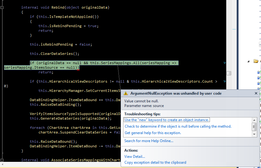 Could someone tell me why I might be getting the attached error? I downloaded to source code (2012.1.326) to catch the exact point when the exception is triggered in the Telerik source. The code is not checking for SeriesMappings to be null. Should I modify the source to return from the method if the SeriesMappings property is null?
